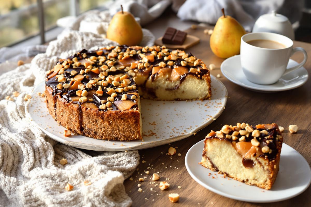 Imaginez un gâteau doux, fondant, rempli de morceaux de poires sucrées et parsemé de chocolat fondu et de noisettes grillées. Vous sentez déjà l’odeur qui s’échappe du four ? Ce dessert simple et rapide à préparer a tout pour devenir votre nouvelle obsession automnale.